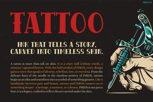 Inkos Display Font: The tattoo font INKOS is a bold and dramatic typeface that is designed to make a strong statement. With its sharp, angular edges and intricate details, it perfectly captures the rebellious and artistic essence of tattoo culture. Moreover, the deep red tones and Gothic-inspired design lend it a timeless yet edgy appearance, making it ideal for projects that require a balance between tradition and modernity. In addition to its striking visual elements, the floral motifs, particularly the roses paired with the skull, evoke themes of life, death, and beauty, creating a visually compelling harmony. Therefore, Inkos Display is not just a typeface but also a storytelling element that adds depth to your design.
