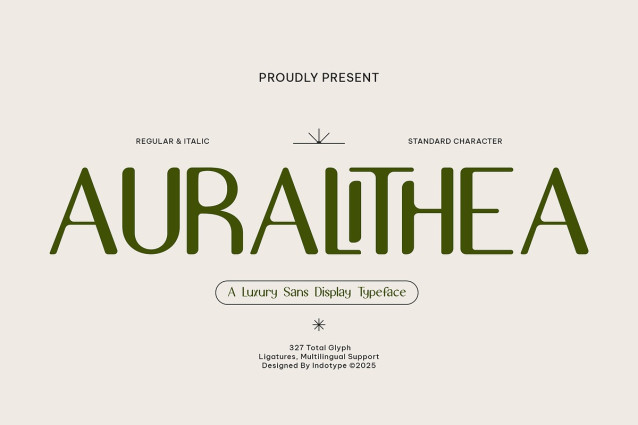 IT Auralithea Font is the epitome of sophisticated minimalism, a luxury sans-serif display typeface designed to elevate your brand with understated elegance. Characterized by its clean lines, refined proportions, and impeccable balance, Auralithea exudes a sense of exclusive quality and modern prestige. It masterfully blends clarity with character, making it perfect for brands that wish to communicate authority and style without saying a word. This comprehensive family includes both Regular and Italic styles, offering tonal versatility for your designs. With an extensive set of 327 total glyphs, advanced typographic features like ligatures, and full multilingual support, Auralithea is as functional as it is beautiful. It is the definitive choice for high-end fashion labels, luxury product packaging, sophisticated editorial headlines, and any identity that demands a timeless, global appeal. • Ideal for: Luxury Fashion Branding, Cosmetic Packaging, Premium Logotypes, Editorial Headlines, Corporate Sophistication, High-End Websites. • Classification: Display, Sans-Serif, Luxury, Geometric, Modern. • Attributes: Elegant, Refined, Minimalist, Prestigious, Clean, Versatile, Sophisticated.