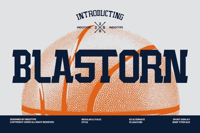 IT Blastorn Font is a high-energy, dynamic display serif built for the fast-paced world of sports, fitness, and action-oriented branding. Its aggressive angles, sharp serifs, and muscular letterforms capture the essence of power, speed, and competition. This font doesn’t just speak—it shouts with bold confidence, making it perfect for designs that need to convey strength and motion. Loaded with 62 stylistic alternates and 13 ligatures, Blastorn offers incredible flexibility to craft unique logos, custom wordmarks, and impactful headlines that stand out. Available in both a solid Regular and a slanted, forward-thrusting Italic style, it provides the versatility needed for team identities, athletic apparel, event promotions, and any project that demands a winning visual impact.