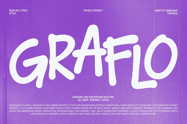 IT Graflo Font is a vibrant, hand-drawn display font that lives at the intersection of classic comic book fun and contemporary street art energy. Characterized by its bold, heavy weight and soft, rounded terminals, it eliminates sharp edges to create an approachable and friendly urban aesthetic. The slight irregularities in stroke width and baseline alignment give it an authentic, bouncy rhythm that mimics natural, energetic handwriting. Embodying a playful and energetic spirit, Graflo is perfect for projects that need to feel youthful, creative, and effortlessly cool. Available in both Regular and Italic styles, it’s ideal for streetwear branding, event posters, creative logos, social media graphics, and any design that aims to capture a dynamic, handcrafted urban vibe without the aggression of traditional graffiti.