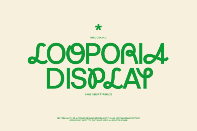 IT Looporia Font is a meticulously crafted, contemporary display sans-serif typeface designed for maximum versatility and modern appeal. It combines clean, geometric foundations with subtle humanist touches, resulting in a font that is both professional and approachable. With its open apertures and balanced proportions, Looporia ensures exceptional legibility and impact across all display applications. This comprehensive family is packed with utility, featuring 286 total glyphs, 36 stylish alternates for custom flair, and full multilingual support—making it a truly global design tool. Available in both clean Regular and dynamic Italic styles, Looporia is the perfect workhorse for branding systems, editorial headlines, web interfaces, and packaging that demands clarity with character.