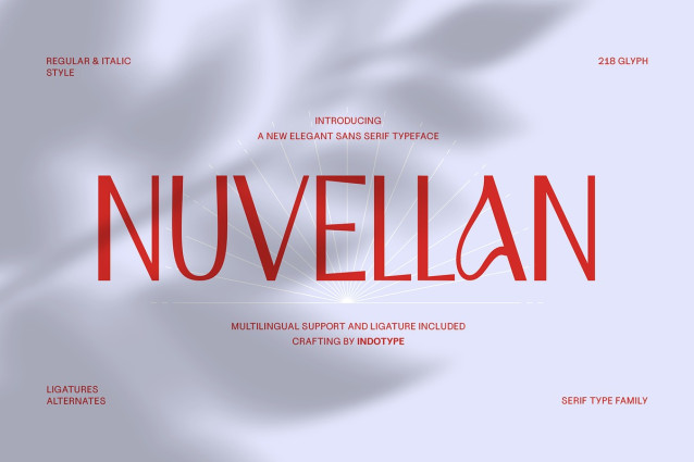 IT Nuvellan Font is an elegant sans serif typeface designed with modern sophistication and refined detail. Its sleek, narrow letterforms balance minimalism with expressive character, making it the perfect choice for designers who want clarity with a touch of personality. This font comes with regular and italic styles, offering versatility for both strong, confident headlines and graceful, stylish text compositions. The inclusion of ligatures and alternates adds a unique flair, allowing endless typographic creativity. With 218 glyphs and multilingual support, Nuvellan ensures global usability across diverse languages and projects. Ideal for branding, fashion editorials, high-end packaging, invitations, posters, and modern digital graphics, Nuvellan combines timeless elegance with contemporary functionality. Its smooth geometry and subtle artistic touches make it not just a typeface but a design statement.