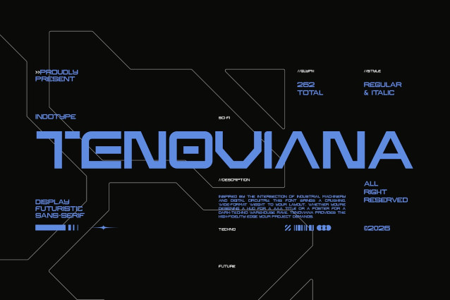 It Tenoviana Font is a crushing, high-fidelity display font forged in the digital underground. It channels the raw, immersive energy of dark techno, warehouse raves, and dystopian sci-fi, blending sharp geometric construction with a gritty, high-voltage aesthetic. This is not a font of the bright future—it’s the typography of the interconnected, high-contrast now, built for projects that demand an uncompromising, cybernetic edge. With 262 total glyphs available in both a solid Regular and a slanted, dynamic Italic style, Tenoviana offers the tools to craft immersive identities for music, gaming, and tech. It provides the stark, authoritative voice needed for experimental music labels, cyberpunk game interfaces, techwear branding, and any visual project operating at the intersection of sound, data, and shadow.