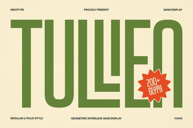 IT Tullien Font is a geometric interlock sans display typeface built with bold modular precision and futuristic personality. Each letter is constructed from clean verticals, tight curves, and interconnected strokes that create a sense of rhythm and symmetry — perfect for modern visual identities and experimental typography. Designed by Indotype (2025), Tullien reimagines geometric sans forms with architectural logic and interlocking letter structures, blending clarity and creativity in a single system. Its tall proportions and compact counter spaces make it strikingly strong in headlines, posters, album covers, and editorial design. With over 200 glyphs, Regular & Italic styles, and uppercase-focused precision, Tullien delivers flexibility while maintaining its bold, mechanical aesthetic. Whether you’re creating futuristic layouts or minimalist branding, Tullien brings a distinct typographic presence that feels both modernist and timeless.
