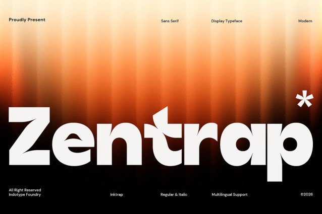 IT Zentrap Font is a striking and intelligent display sans-serif defined by its distinctive ink trap detailing—a functional typographic feature turned bold aesthetic statement. These sharp, intentional cuts at the joints of letterforms give Zentrap a unique architectural quality, creating high contrast and visual interest that stands out at any scale. It’s a font where technical precision meets modern, graphic boldness. Built for versatility, Zentrap includes both a solid Regular and a dynamic Italic style, complemented by full multilingual support for global application. This combination of sharp detail and clean geometry makes it ideal for tech-forward branding, editorial headlines with an edge, sophisticated packaging, and any design project that aims to look meticulously crafted and confidently modern.
