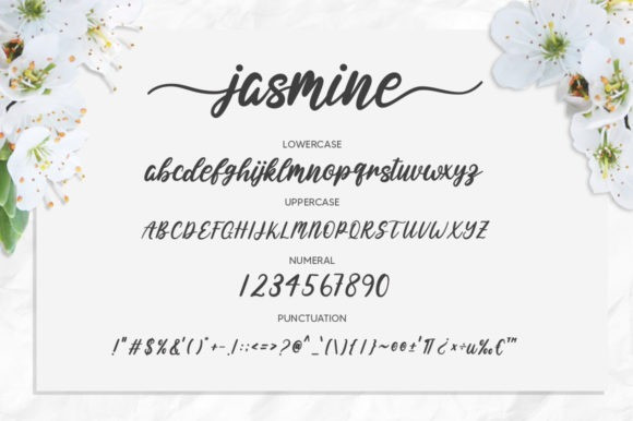 Jasmine Typeface, is a delicate, refined script font that emanates sophistication and elegance. Its stylish alternates and ligatures make this font the perfect match for any project.