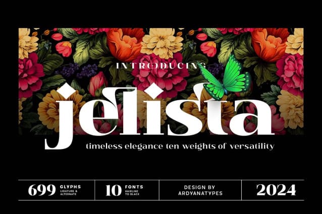 This font is equipped with multilingual support for various languages, finely crafted ligatures to enhance cohesiveness, and alternates that allow creative flexibility in every use. Jelista Font is the perfect choice for branding, editorials, invitations, and design projects that require a unique and captivating touch.
