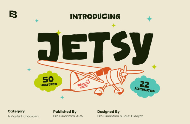 Jetsy Font is a fun, bold, and playful display font with a rough outline texture and whimsical letter proportions that bring lively character to every word. Its unique ligatures add unexpected charm and movement, making the typeface feel expressive and full of personality. Designed to stand out, Jetsy is perfect for branding, kids-themed designs, food and drink projects, headers, titling, and a wide range of creative needs where an energetic and joyful typographic voice is required.