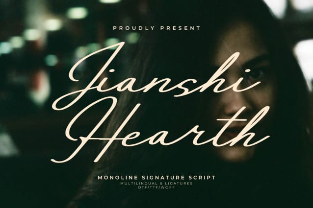 Jianshi Hearth Font | Monoline Signature, from Gracetypestudio, suitable for any projects such as: logos, branding projects, homeware designs, product packaging, mugs, quotes, posters, shopping bags, t-shirts, book covers, name card, invitation cards, greeting cards, label, photography, watermark, special events, and all your other lovely projects that need a beautiful script taste.
