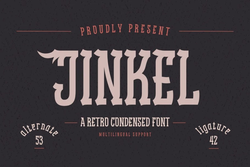 Introducing Jinkel Display Font, the perfect font for any design project requiring a retro condensed style. This font features a unique serif design on each end of the letters, providing a distinctive touch to your designs. Jinkel is perfect for titles, headers, logos, and other creative designs that require a touch of vintage inspiration. With alternate characters and ligatures included, you’ll have plenty of design options to choose from. Elevate your designs with Jinkel and give them the retro flair they deserve.