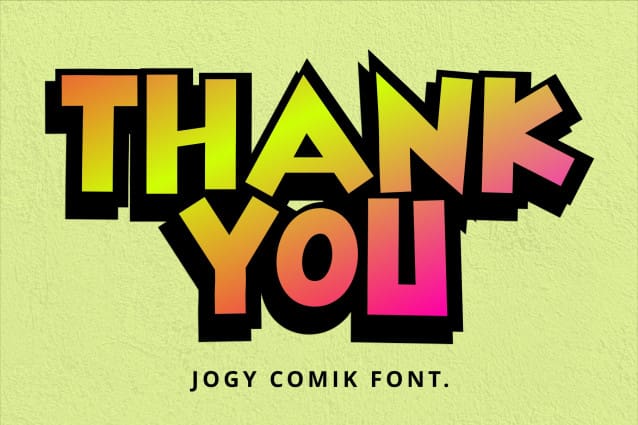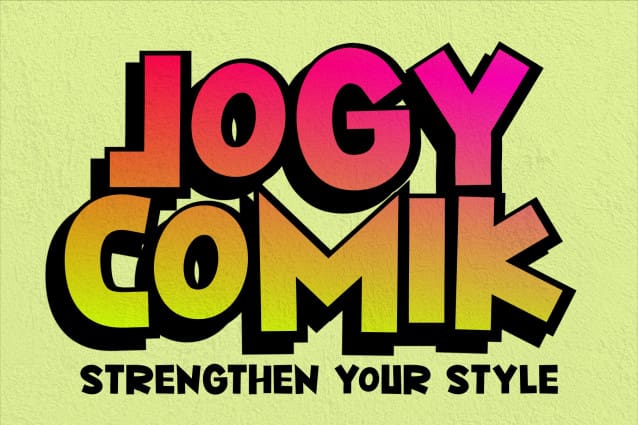 Jogy Comik Font, a fun and playful typeface designed to add a touch of whimsy and creativity. Perfect for comic books, children’s books, posters, and any design that needs a lighthearted and informal feel.