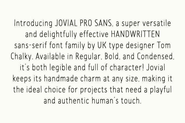 Available in Regular, Bold, and Condensed styles, it offers flexibility for everything from menus and packaging to logos and posters. Jovial Sans Pro is both inviting and versatile, adding an authentic, handcrafted vibe that feels professional yet casual. Whether you’re working on branding, a digital design, or a fun editorial, this font has you covered.
