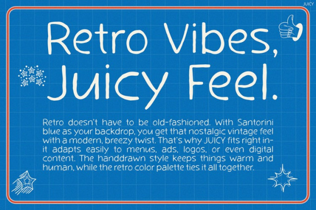 Juicy Handwriting Font: Handwriting Font Juicy starts with a delightful twist. Furthermore, it blends retro vibes with a modern, breezy flair. This, in turn, sets it apart in typography. Its hand-drawn charm features playful curves and clean lines. Additionally, it exudes a nostalgic Santorini blue backdrop. Moreover, the font merges vintage aesthetics with a fresh, juicy feel. Consequently, it adapts easily to various projects. Bold letters come with whimsical stars and doodles. As a result, this creates a warm, human touch. Likewise, the retro color palette ties it together. Therefore, it enhances menus, ads, logos, and digital content. Ultimately, the design transforms ordinary pieces into standouts. In addition, it’s a top choice for personality and nostalgia.