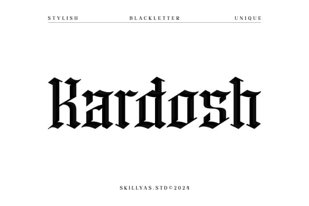 Kardosh Blackletter Font is a Gothic Bold Font, a modern Gothic font that combines elegance and mystery. It is perfect for logos, posters, and branding with a unique, striking aesthetic.