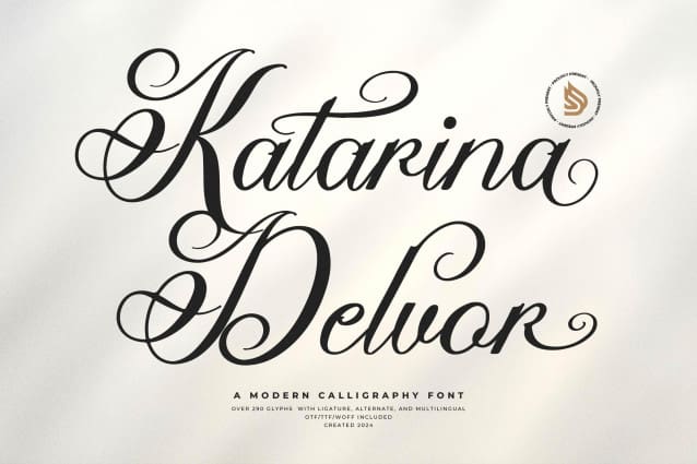 Katarina Delvor Font | Modern Calligraphy Font, from Gracetypestudio, suitable for any projects such as: logos, branding projects, homeware designs, product packaging, mugs, quotes, posters, shopping bags, t-shirts, book covers, name card, invitation cards, greeting cards, label, photography, watermark, special events, and all your other lovely projects that need a Modern Calligraphy Font taste.