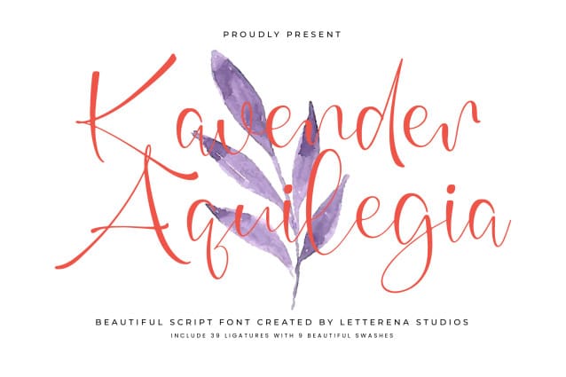 Kavender Aquilegia Font – Beautiful Script Font , from Letterena, is a Luxury Script font, suitable for any projects such as: logos, branding projects, homeware designs, product packaging, mugs, quotes, posters, shopping bags, t-shirts, book covers, name card, invitation cards, greeting cards, label, photography, watermark, special events, and all your other luxury and beautiful projects that need a Luxury Script taste.