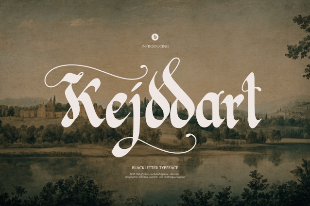 Kejddart Font | Blackletter Typeface, from Denustudios, suitable for any projects such as: logos, branding projects, homeware designs, product packaging, mugs, quotes, posters, shopping bags, t-shirts, book covers, name card, invitation cards, greeting cards, label, photography, watermark, special events, and all your other lovely projects that need a Blackletter Typeface taste.