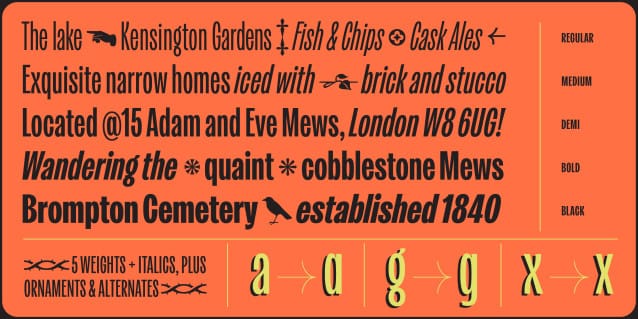 Kensington Font is a narrow, stately, and eclectic sans serif inspired by the exquisitely compact and charming area of West London. From the stately porticos of Victorian-style townhomes, to the quaint, cobble-stoned mews, the ornate museums and embassies, the spires and steeples peeking through the chimney tops, and the whimsical gardens—Kensington’s appeal is in its densely packed variety. This typeface offers the same: a compact charm that you can’t quite tie to one style or time.