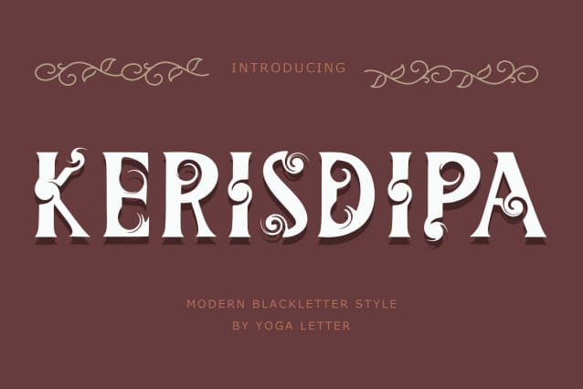 Kerisdipa Display Font is an elegant and unique blackletter special edition font. This font is equipped with uppercase, lowercase, ligatures, numerals, punctuations and multilingual support. Very suitable for use for certificates, culture, social media, business branding, logos, banners, posters, prints and others.