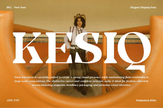 Kesiq Font is a modern serif display font that blends sculptural elegance with contemporary clarity. Designed with high contrast and distinctive curves, Kesiq brings sophistication and authority to every composition. Perfect for luxury logos, fashion campaigns, minimalist packaging, and editorial layouts, Kesiq helps brands communicate refinement and confidence through typography. Whether used for bold headlines or upscale identity systems, this typeface delivers timeless beauty with modern precision.