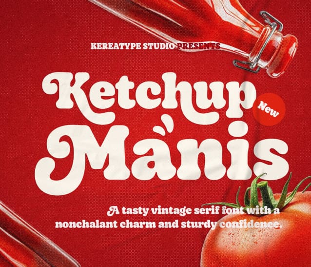 Ketchup Manis Font is a tasty vintage serif font inspired by the nostalgic retro aesthetic making a comeback and the timeless charm of the classic Cooper Black, but with a touch of modern style shapes. Ketchup Manis provides a timeless and friendly feel, making it very suitable for product and packaging design, and any kind of display purposes from the music business to restaurant menus, and from t-shirts to band logos.