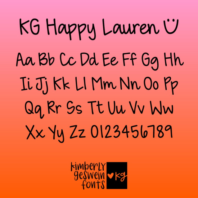 KG Happy Lauren Font is the happiest, sunniest, most cheerful font you could add to your collection. She radiates sunshine and good vibes. The adorable smiley face is accessible via the vertical bar key!