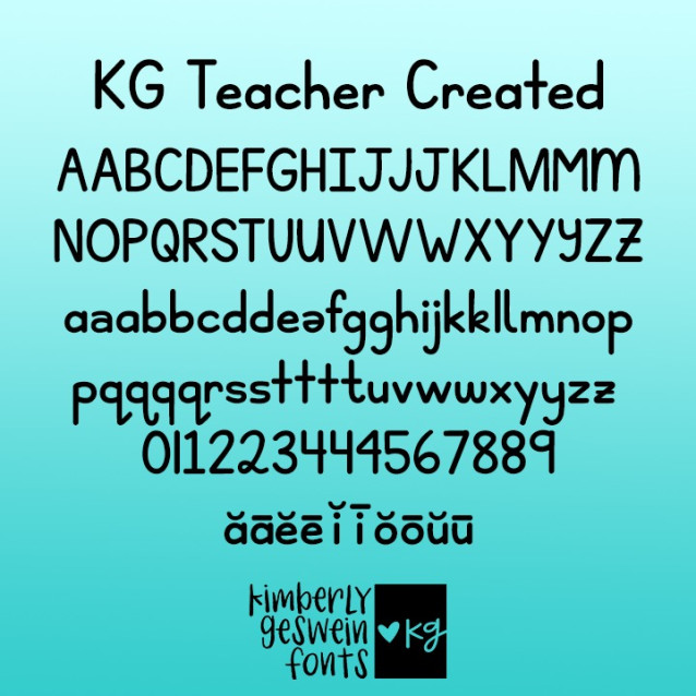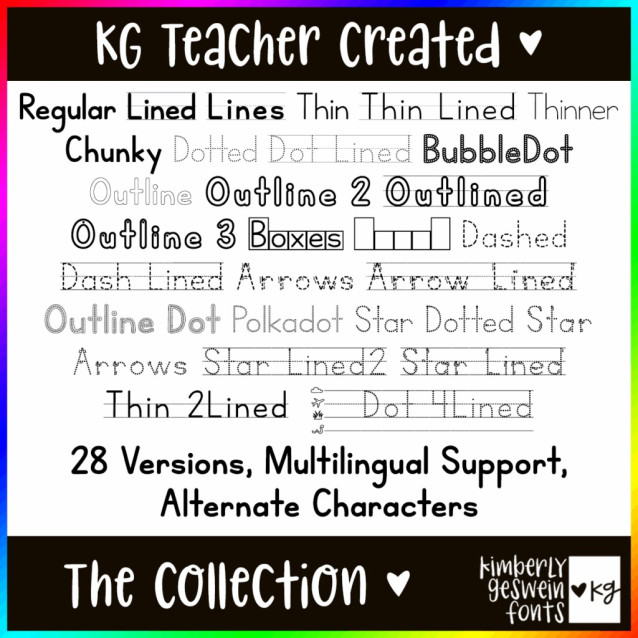 KG Teacher Created Font – The KG Teacher Created Collection is perhaps the ultimate teacher font collection. Each of the 28 versions of the font was created to help teachers in some way- from letter boxes to dots to dashes to everything in between, this collection gives teachers freedom and creativity to create what they need for their classroom and beyond. Please see the enclosed PDF guide for tips on using the fonts. Hundreds of teachers gave input on this collection and it is truly formed with their expertise as my guide. I appreciate each and every teacher who contributed in some way to this collection. The KG family is better because you are a part of it!