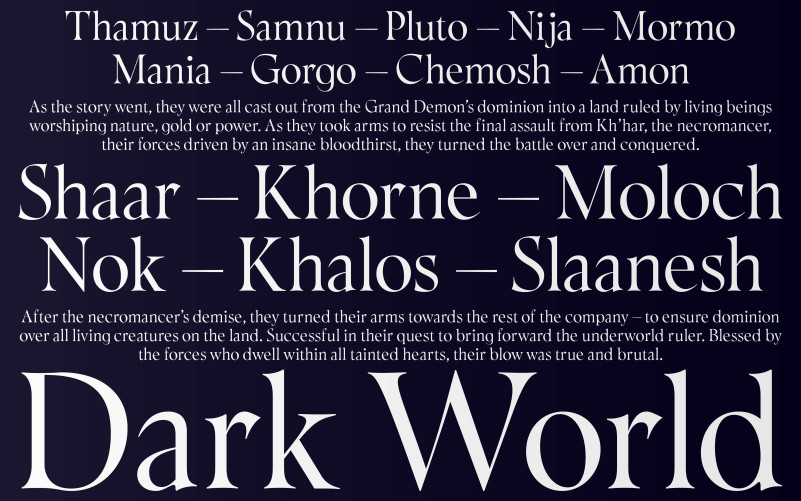 Khalos Font is a font inspired by the adventures of a group of Darshanides on Ultima Online’s shard Dark Prophecy circa 2002. Its long spiky serifs and highly contrasted round shapes are a balance between elegance and barbed feelings. A true echo to the adventures of Shaar, Mentax, Ombrenoire, Khorne, Slanesh, Arcatus and Khalos. This font is a bridge between historical calligraphic ductus and a more modern and sensitive approach to the overall width rhythmic.