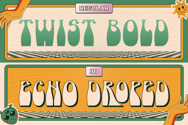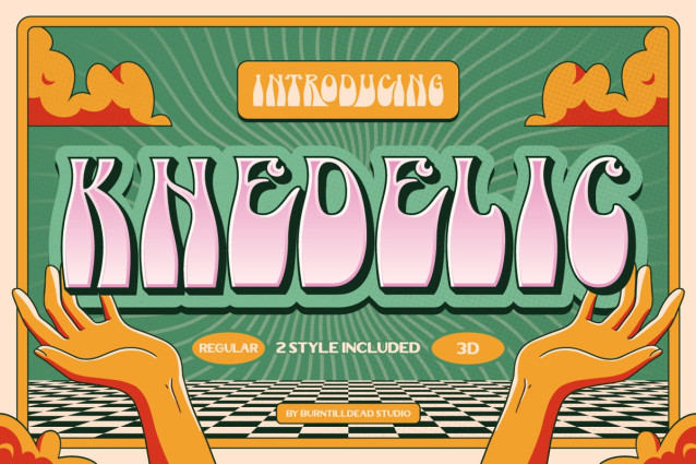 Khedelic Display Font – A trippy, eye catching font that screams retro futurism! A funky retro inspired font that brings the wild vibes of the 60s dan 70s! With its wavy shape, bold look and cool 3D effect, this font is perfect for design that need a groovy, psychedelic touch. It comes with 2 style: Regular and 3D. Khedelic best for music poster, festival flyer, vintage logos, fun social media post, band merch, album covers, concert posters, creative brands and so on.