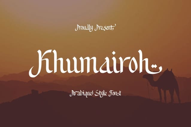 Khumairoh Font, a new Arabic font, inspired by classic Latin handwriting and Arabic letters. The letterforms are designed with a blend of Arabic typography and calligraphy. Khumairoh is designed to be versatile so you can use this font for many themes, not just Islamic or Arabic. It can be applied to posters, logos, branding, greeting cards, weddings, clothing, cosmetic labels, packaging, book covers, short body text, quotes and more!