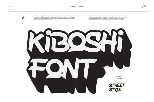 Kiboshi Font is a striking font that combines the bold edge of street style with the nostalgic flair of Y2K fashion and classic typography. Its sleek, contemporary letterforms are infused with dynamic curves and sharp angles, making it ideal for fashion-forward branding, streetwear designs, and bold editorial statements. Kiboshi channels the futuristic yet retro vibe of the early 2000s while maintaining the sophistication of classic font design, offering a perfect blend of modern street culture and timeless elegance. Ideal for logos, apparel, and creative visuals, Kiboshi delivers a unique, trendsetting look that’s both rebellious and refined.