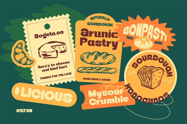 Kietan Font is a chunky display font inspired by food, street snacks, and playful branding. It features bold shapes with soft curves that feel warm, fun, and eye-catching. This font comes with two styles: Regular and Inkbleed, giving you flexibility to create clean looks or a more organic, printed feel. Kietan works great for big titles and short texts where you want strong personality. Perfect for food branding, street food menus, packaging, posters, logos, café visuals, and social media designs.