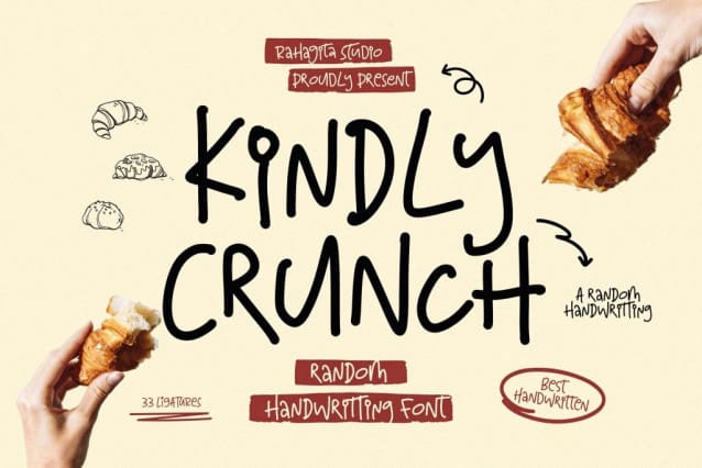Kindly Crunch Font — a random-style handwriting font full of charm and personality! This font captures the warmth of natural handwriting with a playful and casual twist — perfect for food branding, café menus, packaging, children’s designs, and creative illustrations.