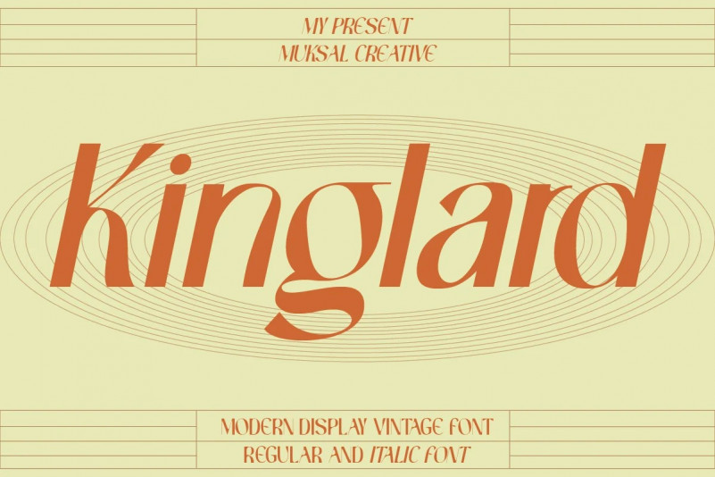 Kinglard Modern Display Vintage Font, special glyphs, ornament and multilingual support. It’s a very versatile font that works great in large and small sizes. Perfect for editorial projects, Logo design, Clothing Branding, product packaging, magazine headers, or simply as a stylish text overlay to any background image.