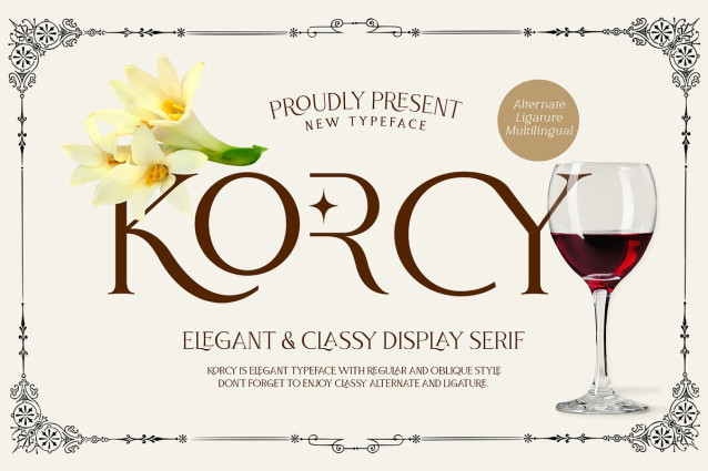 Korcy Font is a display typeface with sharp serifs that contains two styles: Regular & oblique. It comes with many standard ligatures as well as titling alternatives. The font supports many languages using the Latin-based alphabet. Korcy is a typeface that is elegant, contemporary, and urbanic.