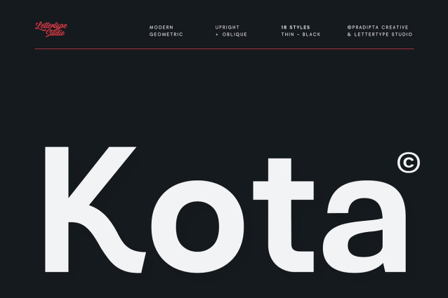 Kota Font is a modern geometric sans-serif designed for branding, logos, headlines, and user interfaces. Its structure is strong and precise for crisp wordmarks, while the spacing and rhythm are carefully tuned for smooth readability in text and editorial layouts. The family includes 18 styles from Thin to Black with matching Obliques, providing the flexibility you need for hierarchy across print and digital platforms.