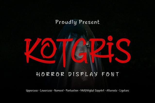 Designed to evoke feelings of suspense, the sharp and irregular characters deliver a haunting visual impact. Whether you’re creating designs for spooky merchandise, thrilling book covers, or immersive gaming experiences, Kotgris adds the perfect touch of terror to your creative projects. Dare to use this font and bring your darkest visions to life with unmatched style and fear-inducing flair.