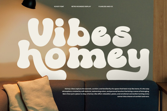 Kovey Display Font is a bold and playful retro display font that brings groovy vibes and nostalgic charm to your designs. With its soft rounded edges and bubbly letterforms, this font captures the essence of vintage aesthetics while staying modern and fresh. Perfect for adding personality and fun, Kovey makes every word feel vibrant and full of life. Whether you’re working on logos, packaging, posters, or social media graphics, Kovey delivers a unique retro touch that instantly grabs attention. Its smooth curves and bold shapes make it versatile for both digital and print projects, ensuring your designs stand out with character and style