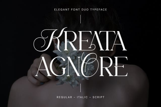 Kreata Agnore Font is a completely new typeface, unique, classy and modern. These fonts include regular, italic and script serif fonts best used for titles, logos, branding, magazines, product packaging and invitations. Its stylish turns and ties with clean lines and smooth curves add an extra touch of class to any project. make this font the perfect partner for any project.