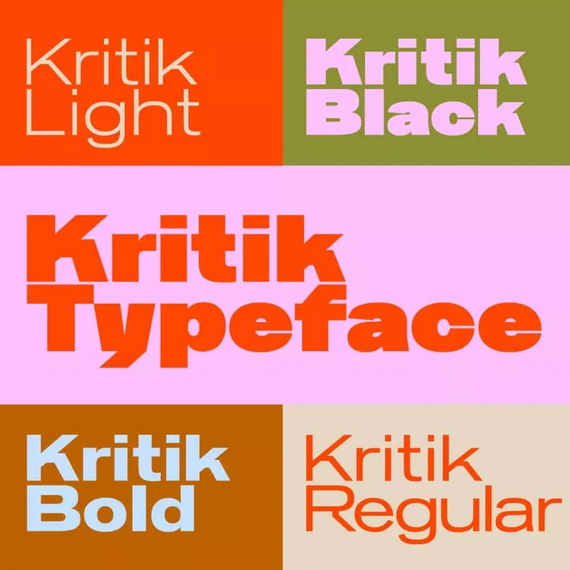 The name comes from the German word “Kritik,” meaning criticism. Criticism can be hard and destructive, or soft and constructive, and in Kritik, both conditions have been turned into one typeface. This produced a type family consisting of 7 weights: Light, Regular, Medium, SemiBold, Bold, ExtraBold and Black.