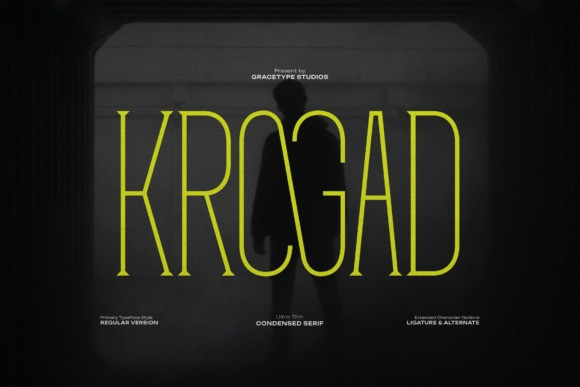 Krogad Font is a striking, ultra-thin, and condensed serif display font that exudes high-end luxury and dramatic architectural elegance. Its extremely tall and narrow structure, combined with sharp serifs and a delicate stroke weight, creates an immediate feeling of sophistication, tension, and high-fashion drama.