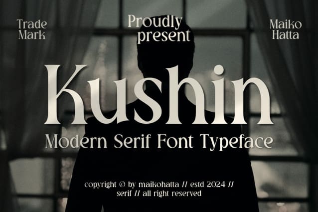 Kushin Font – Modern Serif Typeface. This font features a balanced proportion of stroke thickness and fineness, creating attractive and easy-to-read visuals. This modern serif style is often characterized by a bold distinction between thick and thin lines, providing a touch that is understated but still stands out.