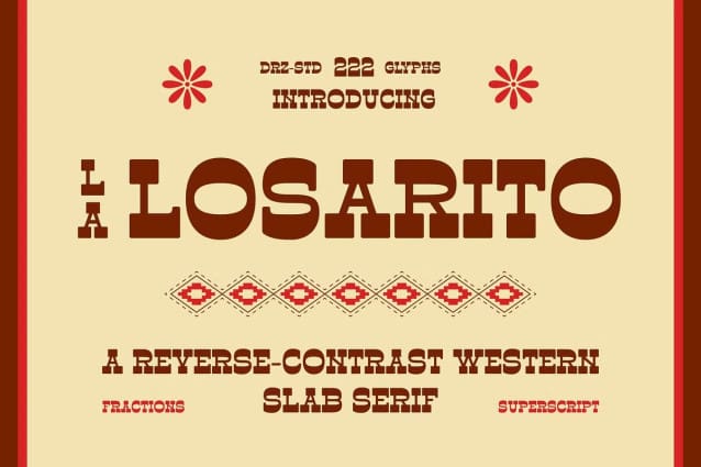 La Losarito Font is a font that draws inspiration from traditional vintage-Mexican design elements. It embodies a blend of cultural heritage and artistic craftsmanship, evoking a nostalgic feel while being suitable for contemporary uses. The font typically features bold, decorative letterforms with intricate detailing that reflect Mexican folk art and typography. La Losarito stands out for its ability to convey a sense of history and tradition, making it a popular choice for designers looking to infuse their work with cultural richness and visual appeal.