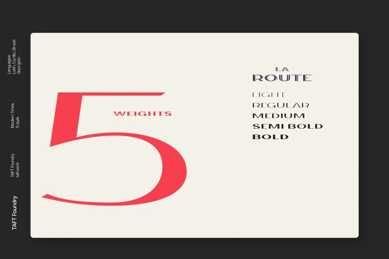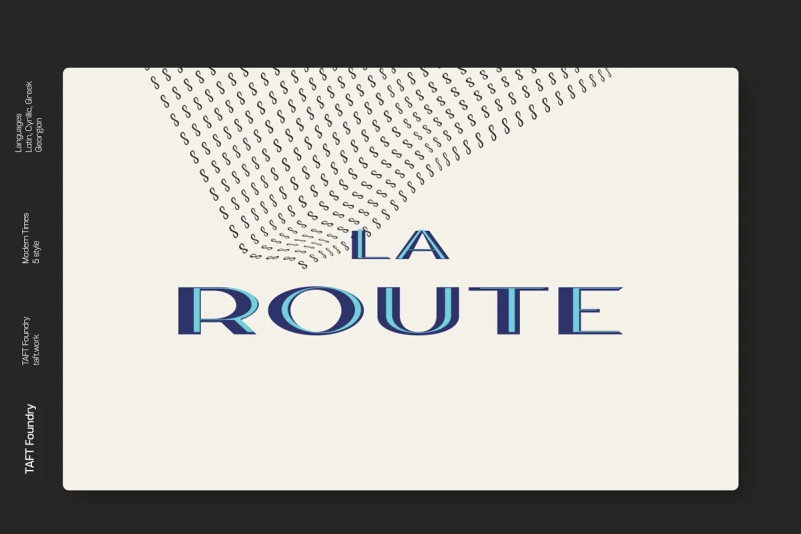 La Route Display Font is inspired by my other font Modern Times. La Route works great in any branding, films, magazines, header, logos, badge, packaging, headline, poster, t-shirt/apparel. La Route gives you options to explore a whole host of applications and give a real modern feel to any project.