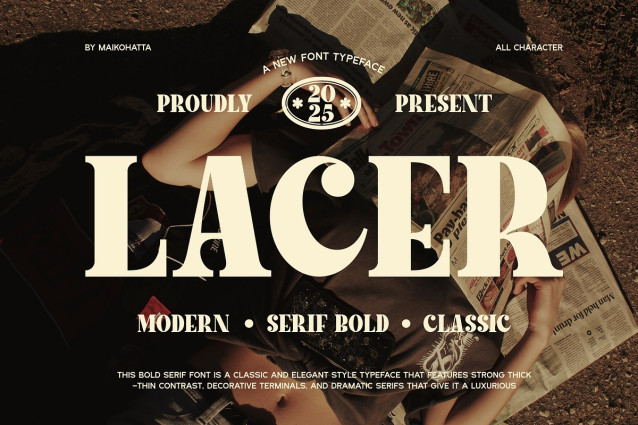 Lacer Font – Serif Bold Typeface. A serif bold typeface features thick, prominent strokes and characteristic serif endings—the small lines or extensions at the ends of letterforms. This style conveys a sense of strength, formality, and classical sophistication. The bold weight enhances visibility and emphasis, making it ideal for headlines, logos, book covers, or any application where readability and authority are important. Serif bold fonts often evoke a timeless, editorial, or traditional feel, while still demanding attention through their weight.