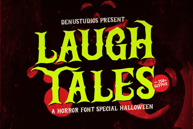 Laugh Tales Font | Horror Halloween Font, from Denustudios, suitable for any projects such as: logos, branding projects, homeware designs, product packaging, mugs, quotes, posters, shopping bags, t-shirts, book covers, name card, invitation cards, greeting cards, label, photography, watermark, special events, and all your other lovely projects that need a Horror Halloween Font taste.
