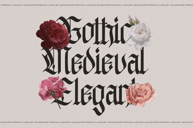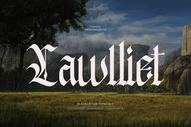 Lawlliet Blackletter Font, from Denustudios, suitable for any projects such as: logos, branding projects, homeware designs, product packaging, mugs, quotes, posters, shopping bags, t-shirts, book covers, name card, invitation cards, greeting cards, label, photography, watermark, special events, and all your other lovely projects that need a Blackletter Typeface taste.