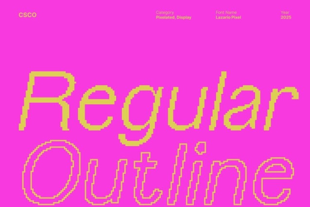 Lazario Pixel Font This is a geometric sans serif display font built with precise thin shapes and a clean, modern structure. Each character is carefully crafted to maintain clarity while embracing a distinct pixel style. This combination creates a font that is both stylish and functional, giving every design a sharp, digital-forward identity.