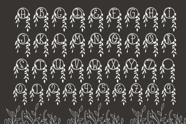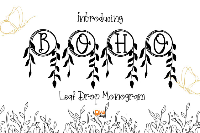 Leaf Drop Monogram Font is a refined serif monogram font adorned with delicate falling leaf motifs. Each uppercase letter is designed with softly cascading foliage, creating a graceful and nature-inspired aesthetic perfect for weddings, seasonal branding, and personalized design projects that embrace organic beauty.