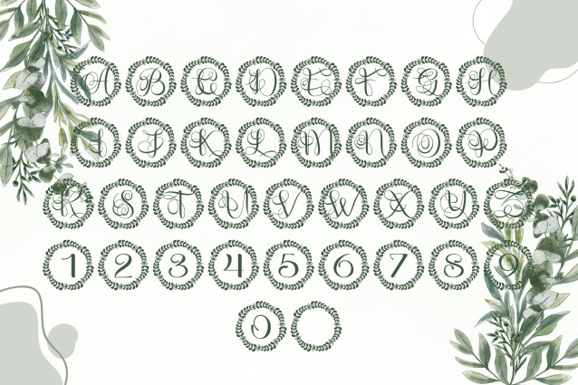 Leafinity Monogram Font is a refined serif monogram font wrapped in flowing botanical accents. Each uppercase character is adorned with graceful vine and leaf illustrations, creating an elegant and organic look perfect for nature-inspired designs, branding, wedding decor, or personalized gifts.